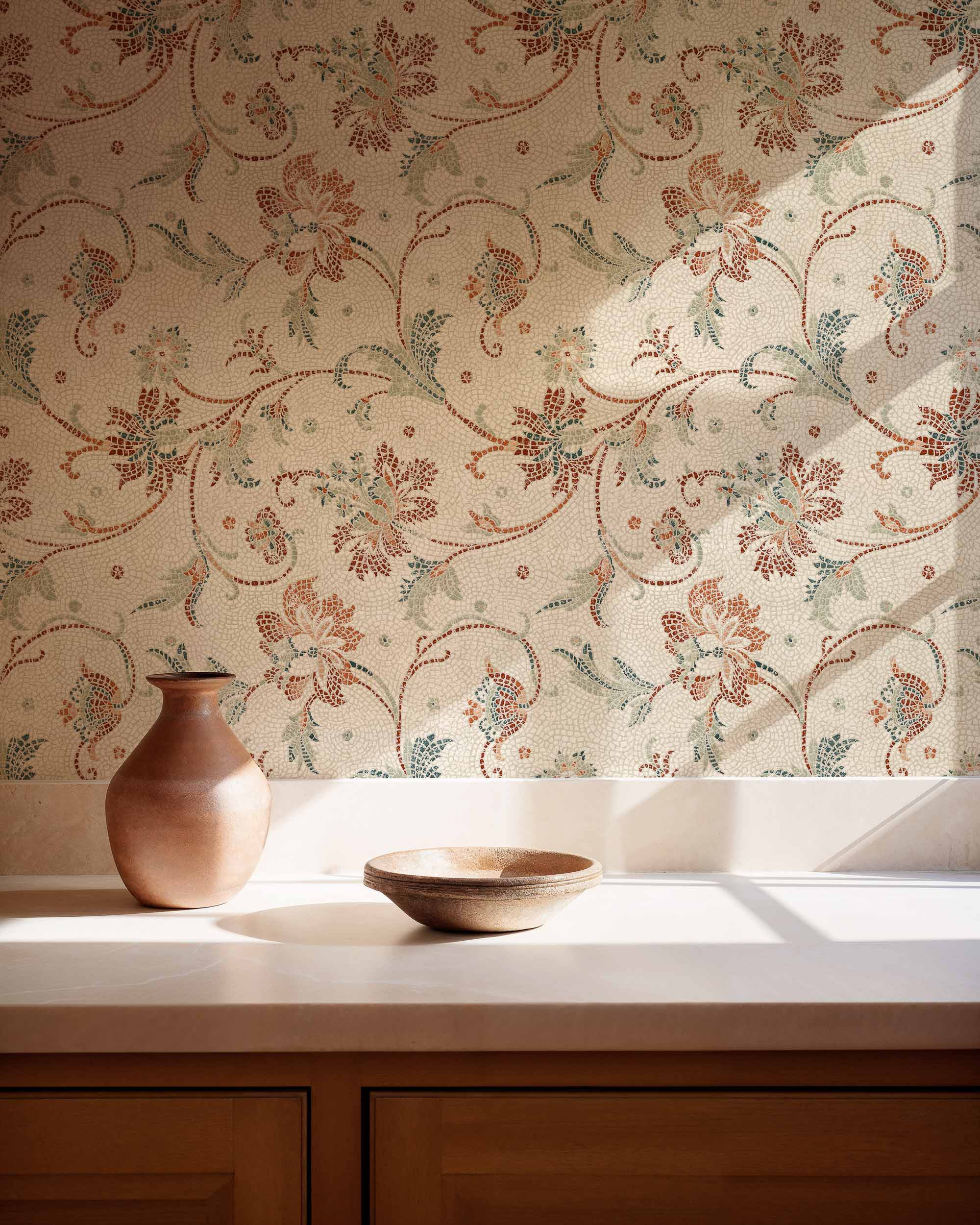 Het Mosaicum ontwerp uit de Pompei collectie van Coordonné is geïnspireerd door antieke Pompeïaanse mozaïeken. Het combineert marmer en glazen tesserae voor een verfijnd, klassiek patroon, dat de historische schoonheid naar moderne interieurs brengt.