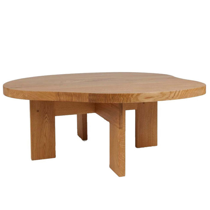 Deze salontafel is gemaakt van massief eikenhout en heeft een unieke, organische vorm die doet denken aan een vijver. Rustend op stevige schragen en geïnspireerd door traditionele boerderijen, combineert de tafel landelijke charme met een sculpturaal ontwerp en wordt zo een opvallend middelpunt in de woonkamer.