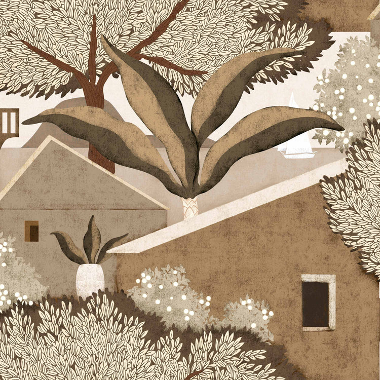 Nopoló van Coordonné is een grafisch ontwerp uit de Sarape-collectie. Kleurrijke gevels en tuinen waar grote planten groeien onder de schitterende woestijnzon.