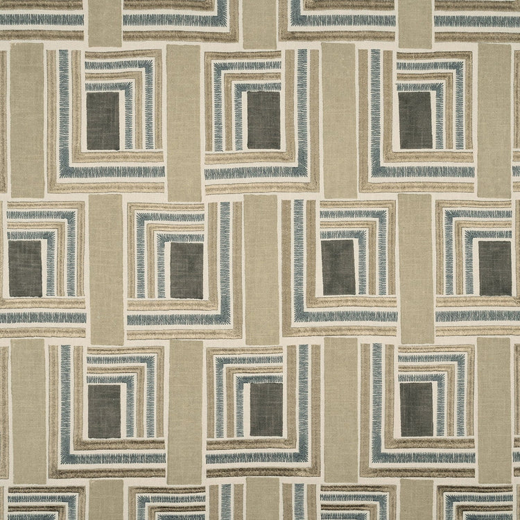 De kleurvlakken zijn met de hand gedrukt en omlijst met brede geborduurde lijnen in matte en glanzende garens. Dit geeft de stof extra diepte. De kleuren variëren van rustige marmertinten tot sterkere kleuren, geïnspireerd op de stijl van de jaren 30. Verkrijgbaar in vier varianten.
