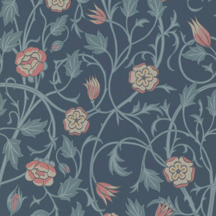 Dit behang is geïnspireerd op het werk van May Morris, dochter van William Morris en invloedrijk lid van de Arts & Crafts beweging. May stond bekend om haar verfijnde borduur en sieradenontwerpen en zette zich in voor vrouwelijke kunstenaars via de Women’s Guild of Arts. Het dessin toont een elegant patroon van verstrengelde ranken, sierlijke stelen en bloeiende tulpen, gebaseerd op een laat-19e-eeuws weefsel dat vroeger in kamers werd gebruikt als decoratie. Verkrijgbaar in 6 kleuren.
