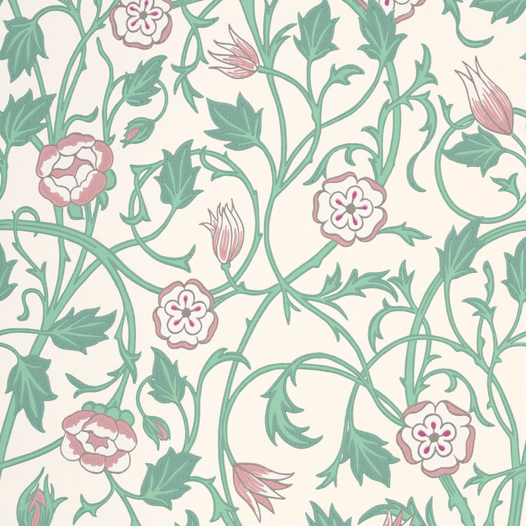 Dit behang is geïnspireerd op het werk van May Morris, dochter van William Morris en invloedrijk lid van de Arts & Crafts beweging. May stond bekend om haar verfijnde borduur en sieradenontwerpen en zette zich in voor vrouwelijke kunstenaars via de Women’s Guild of Arts. Het dessin toont een elegant patroon van verstrengelde ranken, sierlijke stelen en bloeiende tulpen, gebaseerd op een laat-19e-eeuws weefsel dat vroeger in kamers werd gebruikt als decoratie. Verkrijgbaar in 6 kleuren.