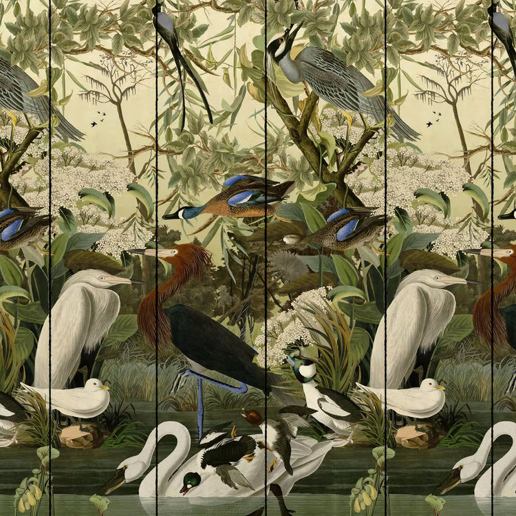 Vogels in de lucht, bloeiende bloemen en rustige wateren vormen samen een prachtig geheel op dit paneel. Het ontwerp brengt de flora en fauna op een harmonieuze manier samen en laat de schoonheid van de natuur spreken. Met oog voor detail en een artistieke uitstraling verandert dit ontwerp elke ruimte in een plek vol rust, charme en natuurlijke elegantie.