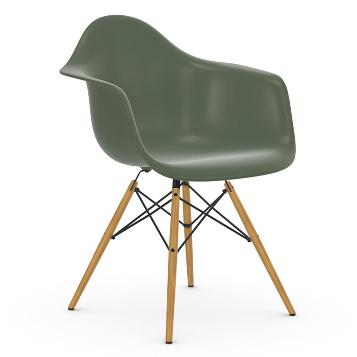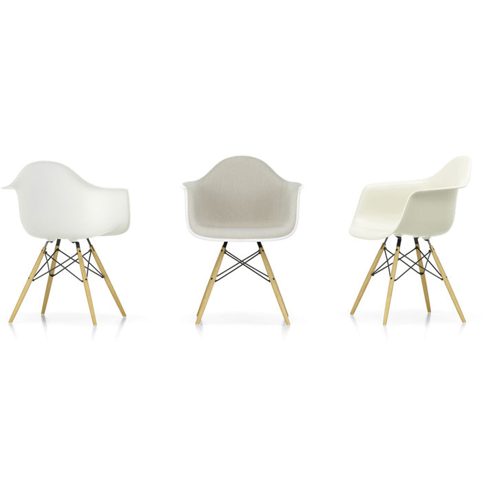 Vitra Eames DAW stoel. Vandaag lijken de Plastic Chairs van Charles en Ray Eames het standaardvoorbeeld van stoelen waarvan de schaal met verschillende onderstellen gecombineerd kunnen worden. De combinatie van het houten onderstel met de kunststof schaal van de DAW (Dining Height Armchair Woord Base) zorgt voor een rijk contrast tussen materialen. De zitschalen zijn ook verkrijgbaar met een zitkussen of volledig gestoffeerd. Bekijk de Vitra collectie.