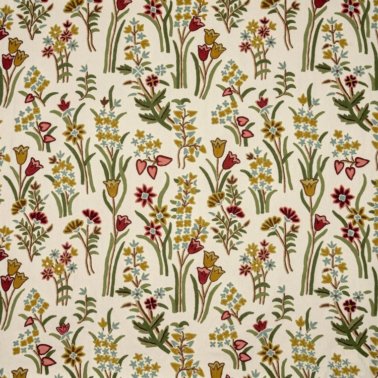 Fleurs de Printemps is een romantische stof met naïeve bloemboeketten, traditioneel met wollen draad geborduurd op een katoenen achtergrond. Het ontwerp combineert eenvoud met verfijnde detaillering en geeft een zachte, elegante uitstraling.