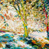 Aan de rand van het struikgewas brengt schilder Gaël Davrinche op gepassioneerde wijze de kleuren, materialen en de sfeer van het gouden uur en zijn betoverende licht tot leven. De kleuraccenten slepen de bomen mee in de schaduw van dit intrigerende landschap. De vinyldrager, gelamineerd op een non-woven achterkant met een stoffen effect, roept herinneringen op aan het canvas van de kunstenaar. Dit behang is een paneel van B 392 x H 300 cm.