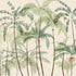 Handgeschilderde palmbomen met een vintage uitstraling geven een weelderig en luchtig decor, met aapjes die tussen de bomen slingeren. Louie in Green heeft een warme beige achtergrond met verschillende groen en bruintinten.