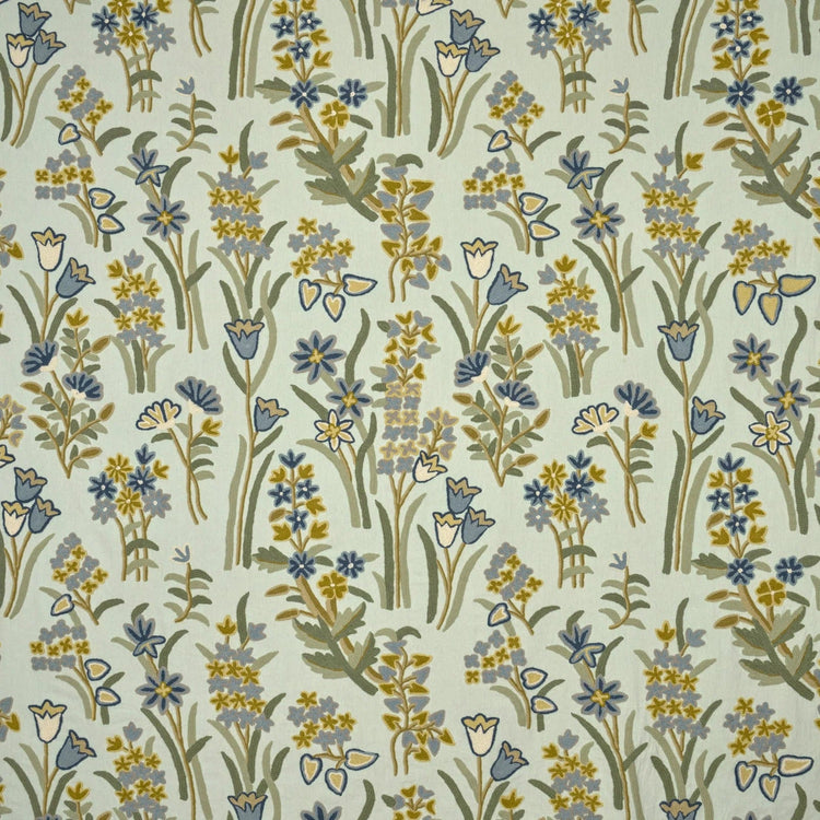 Fleurs de Printemps is een romantische stof met naïeve bloemboeketten, traditioneel met wollen draad geborduurd op een katoenen achtergrond. Het ontwerp combineert eenvoud met verfijnde detaillering en geeft een zachte, elegante uitstraling.