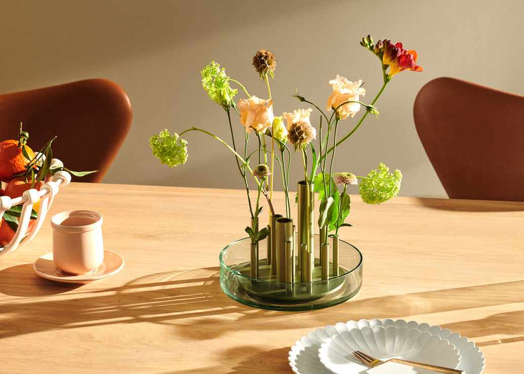 De in 2022 ontworpen vaas vindt zijn inspiratie in de eeuwenoude kunst van het Japanse bloemschikken, bekend als Ikeru. Met een transparant ontwerp nodigt het uit om de bloemen vanuit elke hoek te bewonderen, van stengel tot kroon. De diverse hoogtes van de fluiten komen samen en vormen als het ware een betoverend 'landschap' waarin de bloemen oprijzen. Ondergedompeld in het water van de glazen bak blijven de bloemen langdurig fris en levendig.