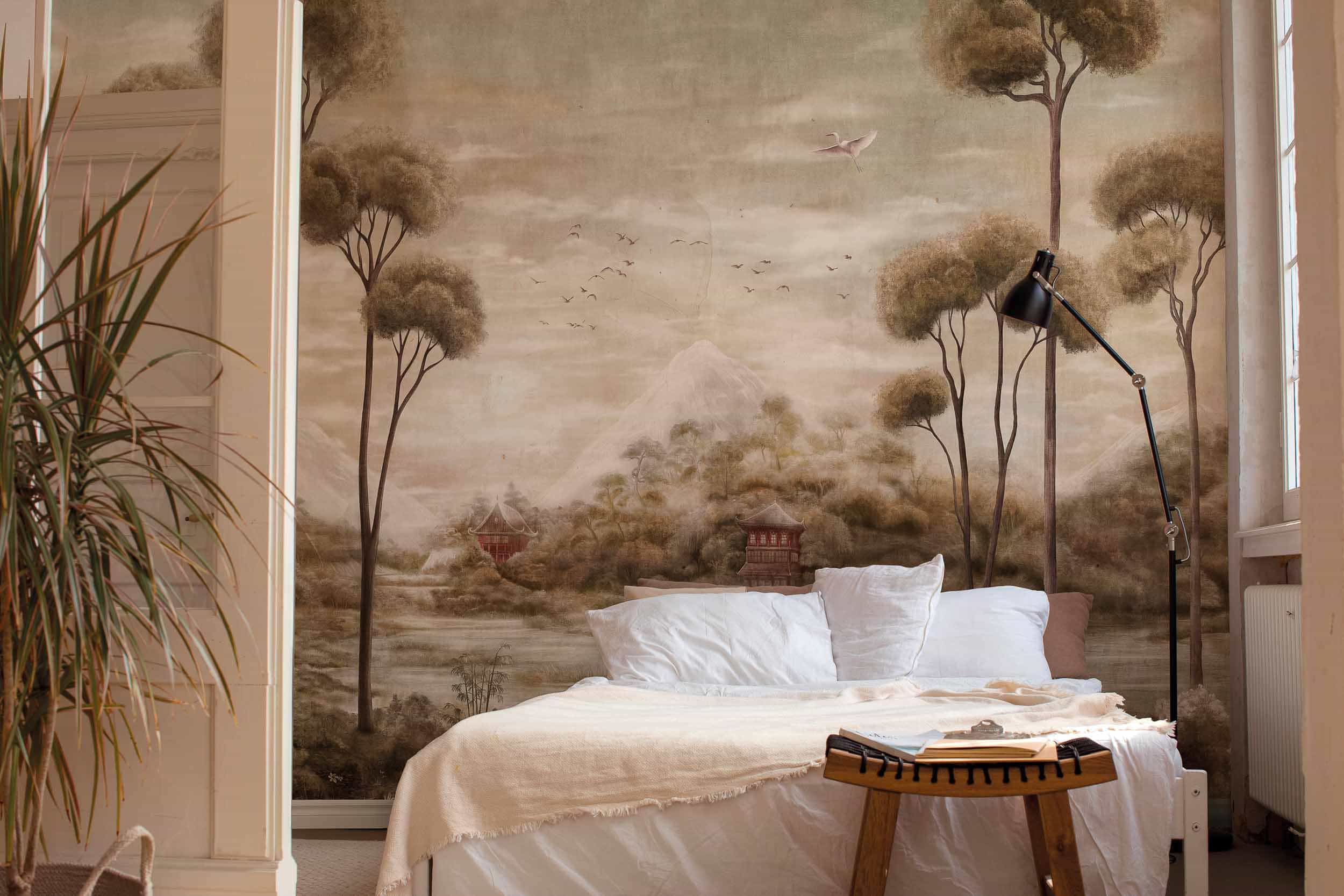 Het Xi Hu Lake-behang van Coordonné toont een betoverend oosters landschap met architectuur en een mystiek meer tussen bergen. Het maakt deel uit van de Forbidden City-collectie en is verkrijgbaar in kleuren zoals Jade, Onyx en Amber.