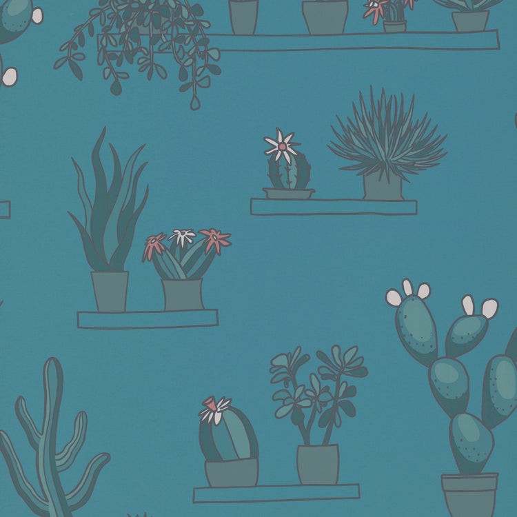 Mr Straw’s Greenhouse is een helder en speels behang met geïllustreerde vetplanten en cactussen, geïnspireerd op de kas van de broers Straw. De planten staan overzichtelijk op planken, wat het dessin rustig en grafisch maakt. Verkrijgbaar in zowel subtiele kleurtonen als krachtigere contrastkleuren, waardoor het goed past in verschillende interieurs.