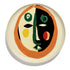 Crèmekleurige serveerschaal van aardewerk met een oranje, groene en zwarte beschildering van een gezicht door Ottolenghi.