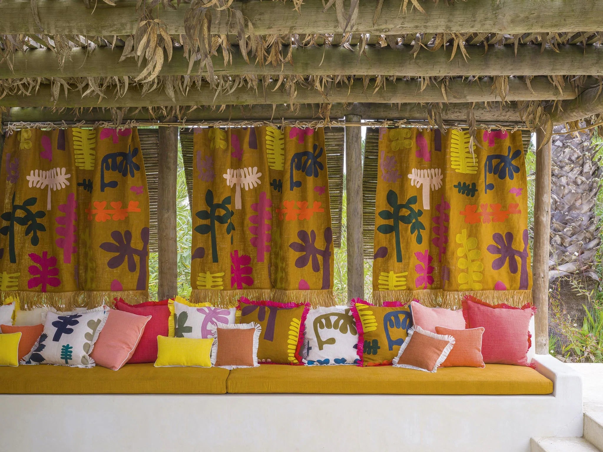 Deze stof heeft prachtige grafische vormen en weergeeft kleurrijk borduurwerk op linnen. Het patroon straalt vrolijkheid en speelsheid uit. Verkrijgbaar in twee kleursamenstellingen, bekijk ook de Paradiso Tangerine